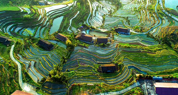 紫鵲界梯田高處無任何山塘、水庫,但山高林密,生態(tài)環(huán)境原始優(yōu)越,梯田依靠森林植被、土填、田埂綜合形成儲水保水系統(tǒng),憑借神奇獨(dú)特的基巖裂隙孔隙水源,構(gòu)成純天然自流灌溉工流水,四季不絕、久旱不竭、洪澇無憂,堪稱人類最偉大的水田工程。