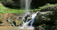 流水被巖石撞擊,掀起一米多高的波濤,聲如悶雷,再往前,就是蔚為壯觀的白水瀑布了。澗水從石壁上撲落下來,宛似銀河瀉地,如花翻卷,五彩繽紛,幽寂移情,洞左山顛,有謝居間觀星臺遺址,洞右有落雁池,再往前還有水簾洞,梳妝臺,一線天諸景。又十里是羅山水庫,遍地松杉,鳥鳴成韻。